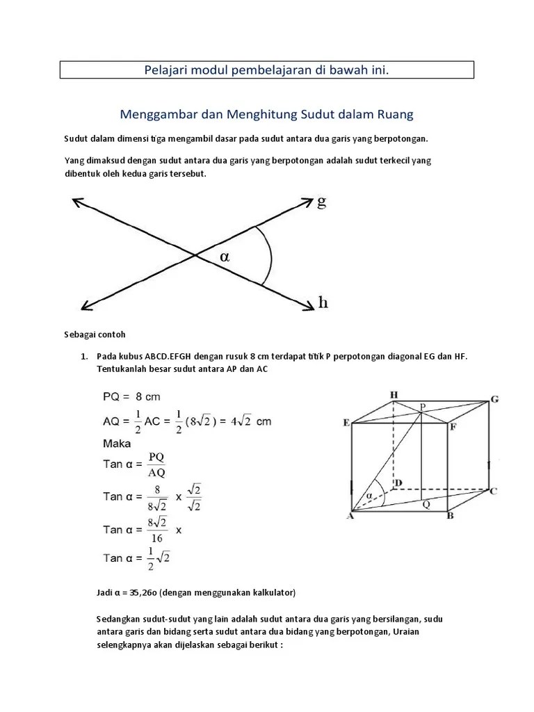 Sudut antar garis adalah sudut yang terbentuk akibat perpotongan dua garis pada satu titik. Besar sudut langsung bisa ditebak a). Cara mencari besar sudut antara garis dan bidang).jika sudah paham dengan materinya, silahkan simak dan pahami contoh soal di bawah ini. Semoga video ini bisa bermanfaat! 448 buku guru kelas x smamasmkmak edisi revisi 22.